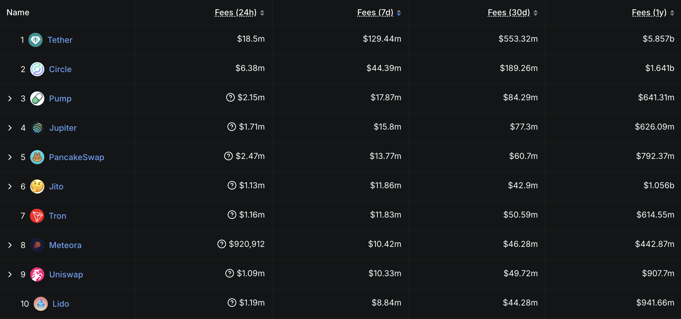 Що стосується комісій за застосунки, моментум Solana настільки ж очевидний. Чотири з десяти найбільших застосунків за генерацією комісій за останній тиждень—PumpFun, Jupiter, Jito та Meteora—зосереджені на Solana.