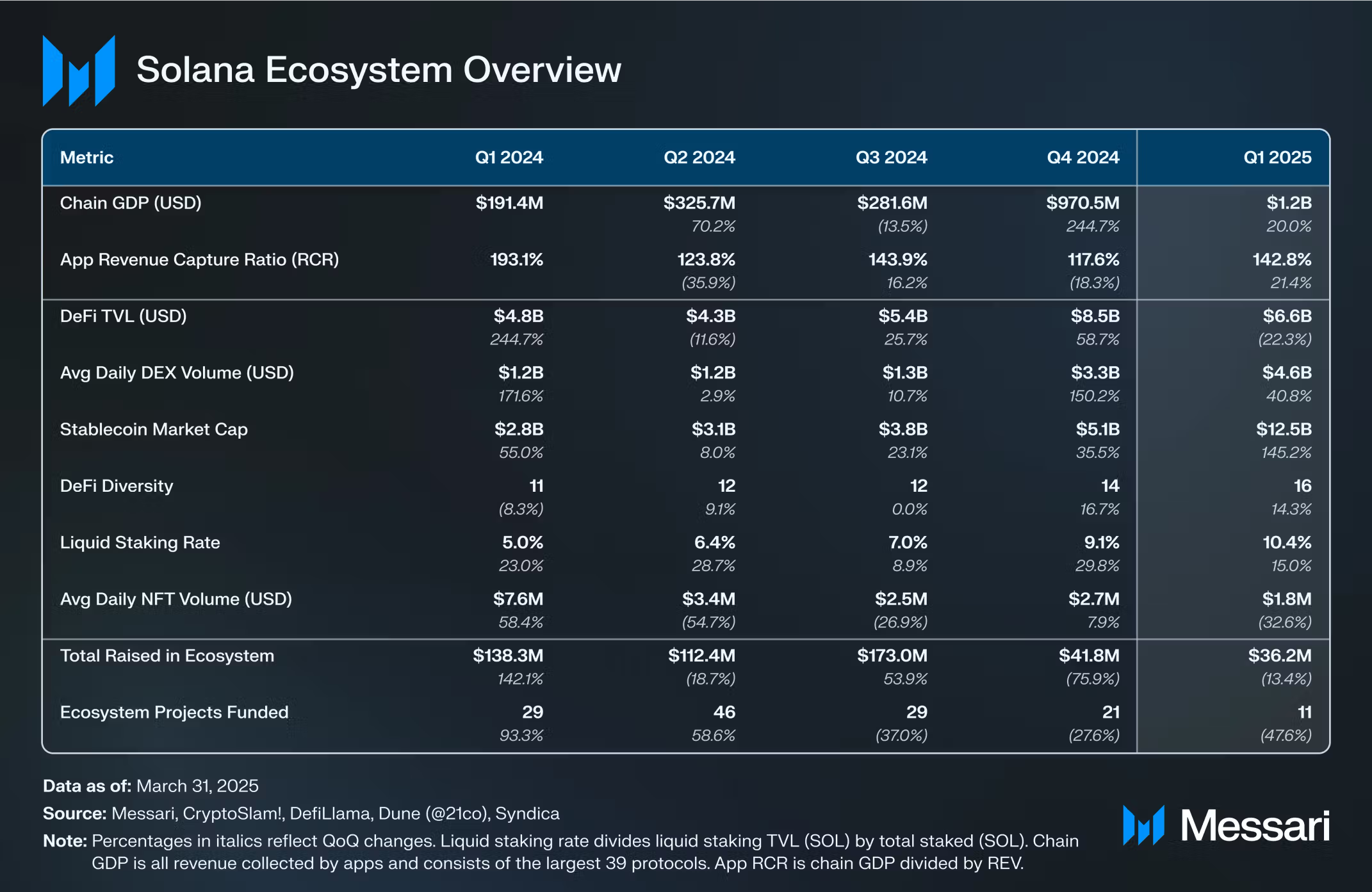 Згідно з звітом Messari, Solana (SOL) досягла загального доходу від додатків (Chain GDP) у розмірі 1,2 млрд доларів у першому кварталі 2025 року. Цей результат означає зростання на 20 % у порівнянні з попереднім кварталом, коли дохід становив 970,5 млн доларів. Це найуспішніший квартал для Solana за останні 12 місяців, що демонструє сильне відновлення екосистеми після року значної волатильності.
