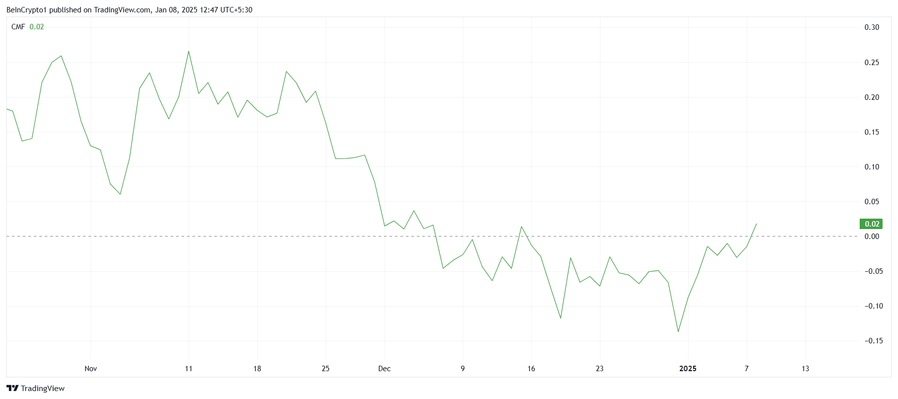 На макрорівні індикатор Chaikin Money Flow (CMF) сигналізує про зростання, що є позитивним знаком для відновлення Solana. Позиція CMF вище нейтральної лінії відображає зростання припливів у криптовалюту, що історично підтримує відновлення цін.