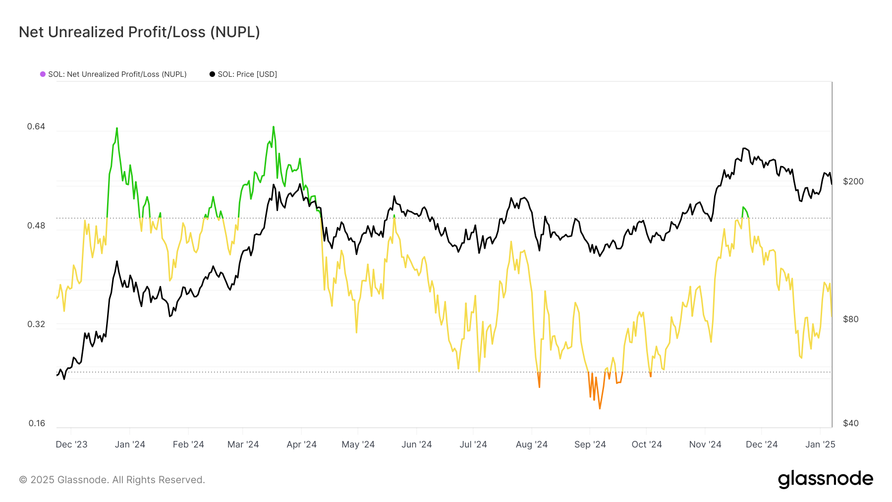 Метрика Net Unrealized Profit/Loss (NUPL) показує, що інвестори Solana залишаються оптимістичними, багато хто все ще тримає прибуток. Історично присутність Solana в цій зоні часто призводила до стагнації. Це зменшує ймовірність різких падінь, але також знижує шанси на стійкий підйом.