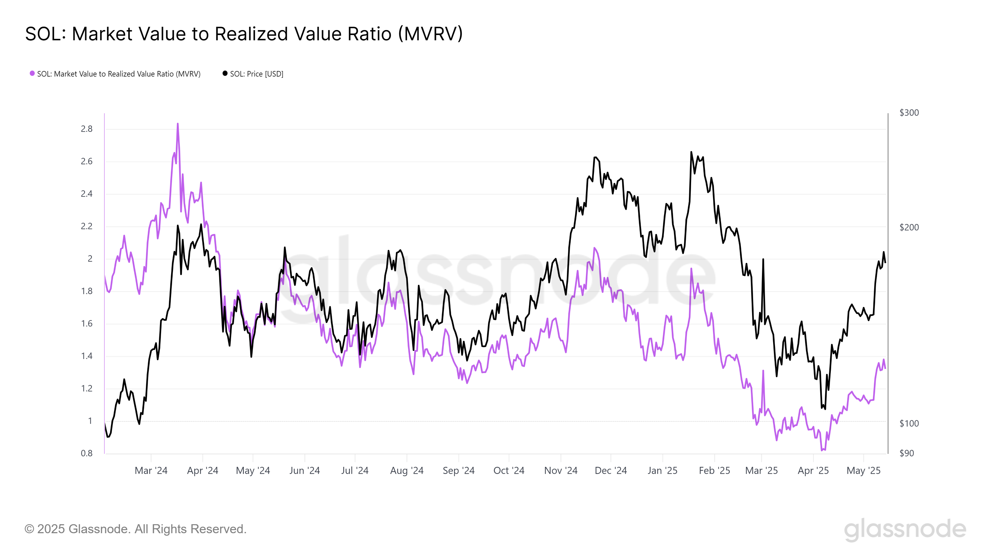 Індикатор MVRV для Solana наразі становить 1,3, що свідчить про те, що токен далекий від перекупленості. Історичні дані показують, що поріг перекупленості знаходиться близько 1,8, що вказує на те, що Solana має простір для зростання перед можливим коригуванням ціни. Це позиціонує SOL для подальшого руху вгору без негайного ризику розвороту.