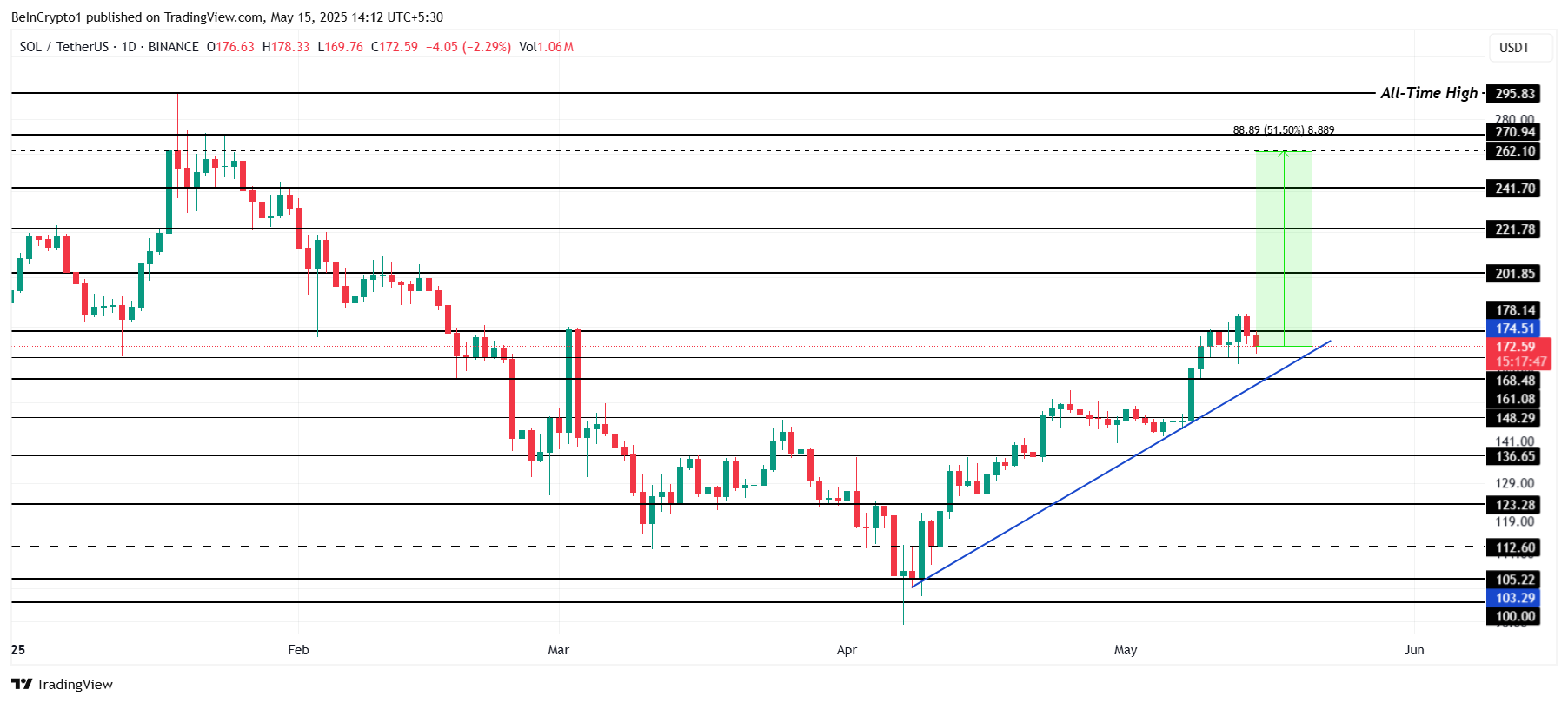 Макроціль для Solana становить зростання на 51 %, досягнувши 262 доларів до кінця другого кварталу. Досягнення цього дозволить відновити втрати, зафіксовані на початку 2025 року, і позиціонувати SOL для виклику свого історичного максимуму понад 295 доларів. Однак закріплення 221 долара як підтримки є ключовим кроком для підтримки цього висхідного руху.