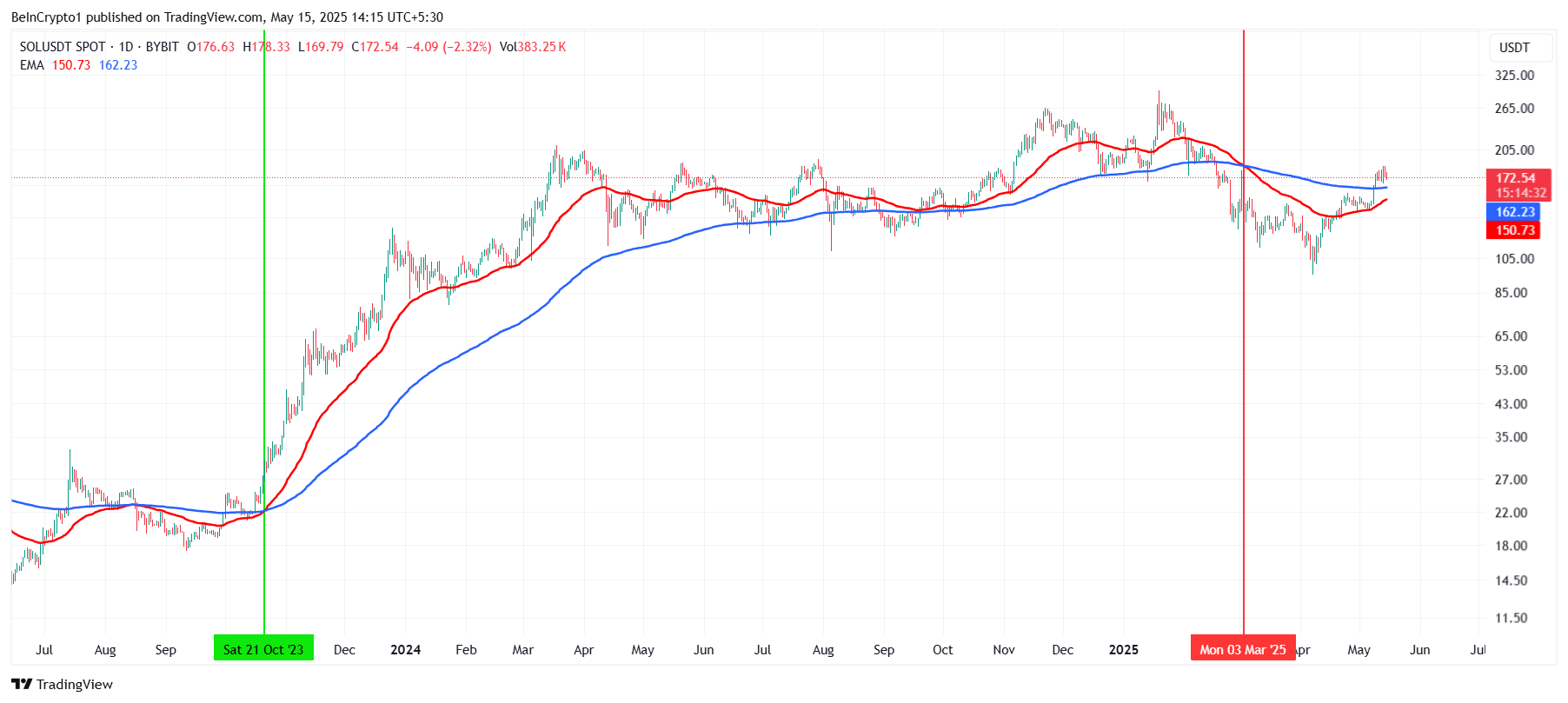 Технічні індикатори вказують на значну зміну імпульсу Solana. 50-денна експоненційна змінна середня (EMA) ось-ось перетне 200-денну EMA, завершивши “хрест смерті”, що тривав понад два місяці. Це перетинання підтвердить Золотий Хрест, бичачий сигнал, який часто супроводжується тривалими висхідними трендами.