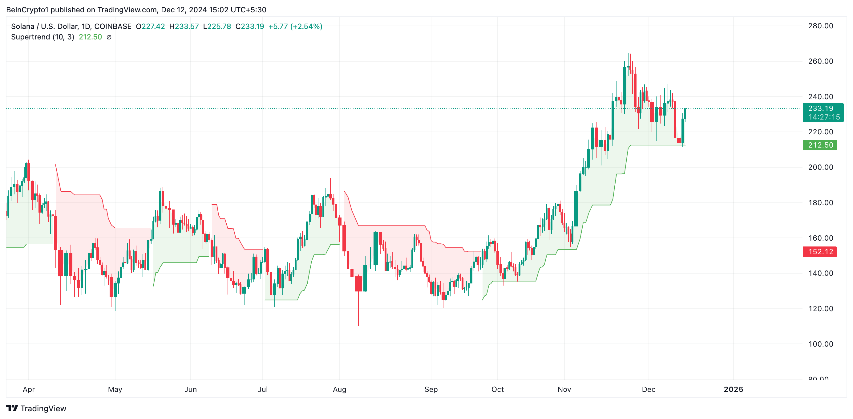 Крім того, 11 грудня SOL відскочив від динамічної підтримки, яку надає його індикатор Super Trend на рівні $212,50, і з того часу піднявся на 10%. Цей індикатор вимірює загальний напрямок і силу цінового тренду. Він з’являється як лінія на графіку, змінюючи колір залежно від поточного тренду: зелений означає висхідний тренд, а червоний — низхідний.