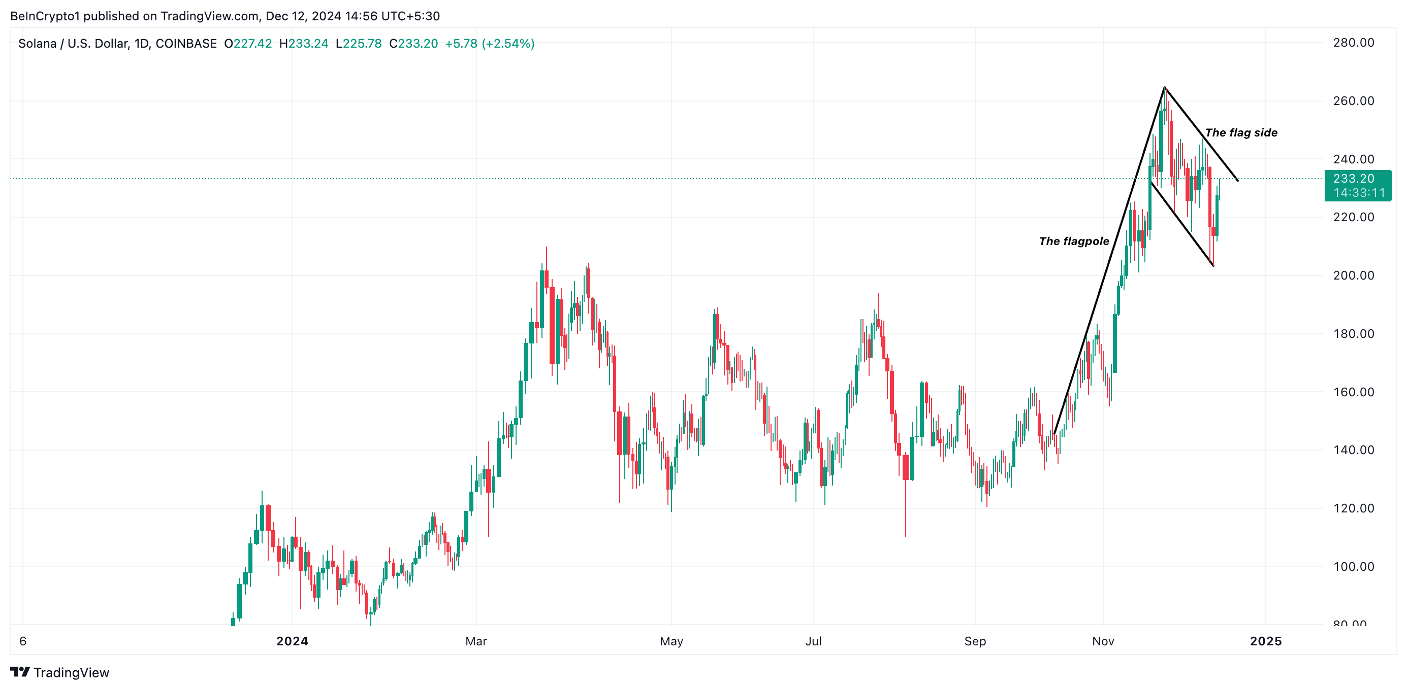 SOL зараз торгується за $233,09, трохи вище підтримки на рівні $228,14. Успішний прорив верхньої лінії консолідаційного діапазону бичачого прапора підштовхне ціну монети до її історичного максимуму $264,63.