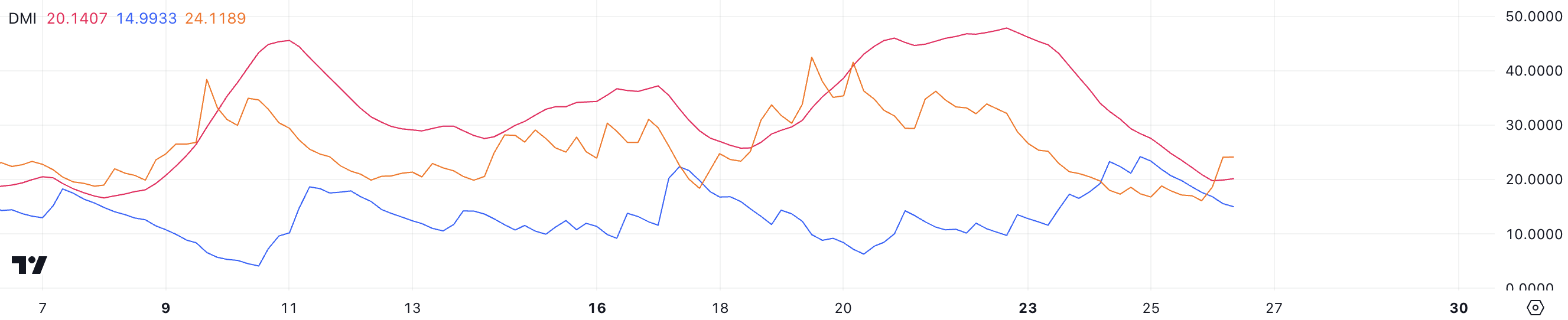 Графік індексу напрямкового руху (DMI) SOL показує, що його середній напрямковий індекс (ADX) наразі становить 20,14, що є різким зниженням з майже 50 лише три дні тому. Це падіння вказує на значне ослаблення сили тренду, навіть якщо SOL залишається в низхідному тренді.