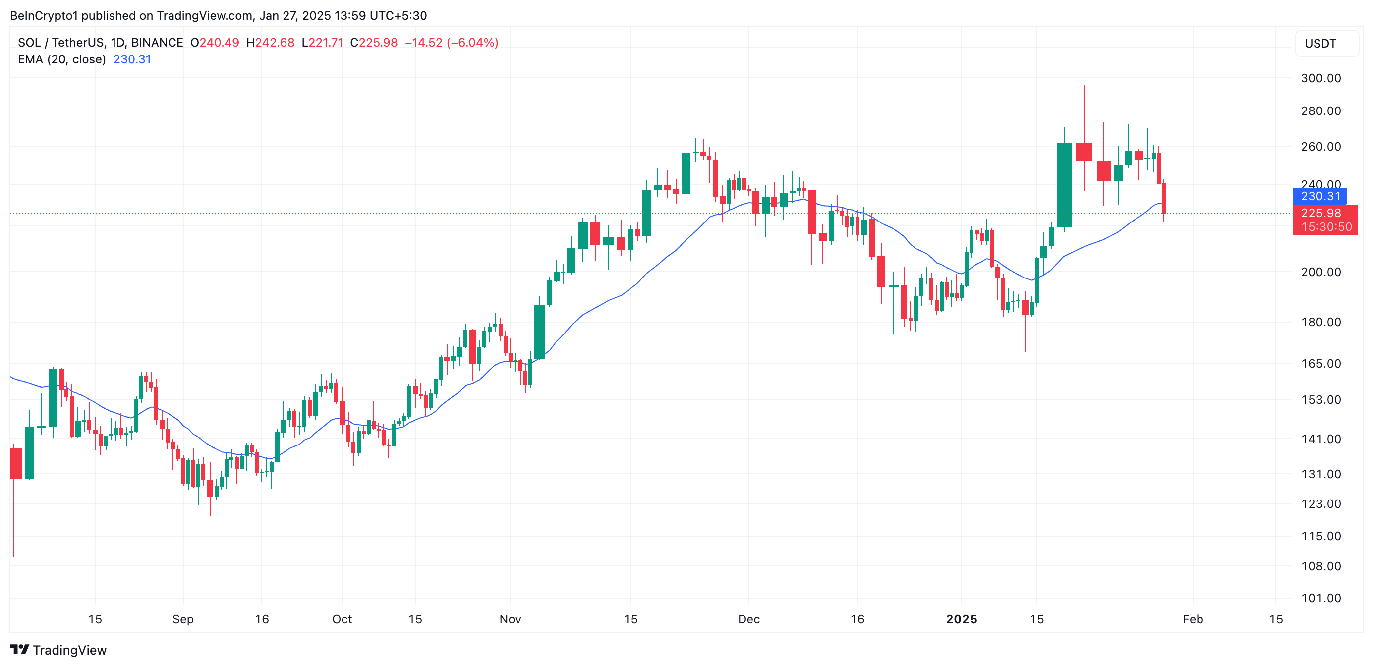 SponsoredНа момент написання статті Solana торгується на рівні $226, показуючи зниження на 9 % за останні 24 години. Це зумовило падіння ціни нижче 20-денної експоненційної ковзної середньої (EMA), що є ключовим індикатором послаблення ринкового імпульсу.