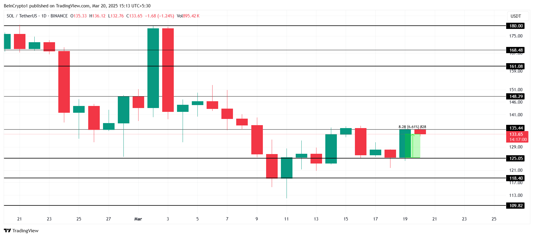 Ціна Solana зросла на 6% за останні 24 години, торгуючись на рівні 133 доларів на момент публікації. Альткоїн залишається нижче позначки 135 доларів протягом кількох днів, намагаючись перетворити 148 доларів у рівень підтримки вже понад місяць. Відсутність імпульсу перешкоджає SOL здійснити рішучий крок угору.
