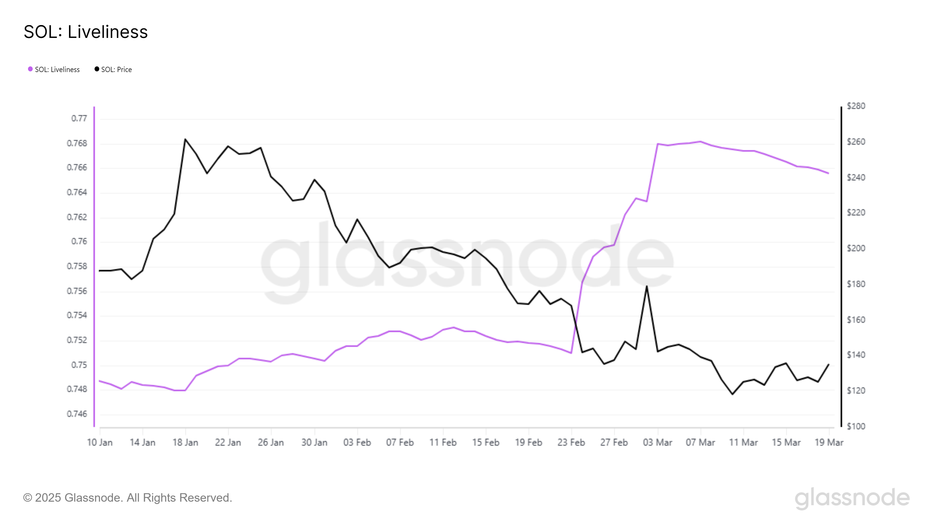 На початку місяця Solana зафіксувала різкий стрибок індикатора Liveliness, що вказувало на значні ліквідації. Однак поточний спад цього показника свідчить про повернення до накопичення. Це може стати буфером проти серйозних корекцій ціни.