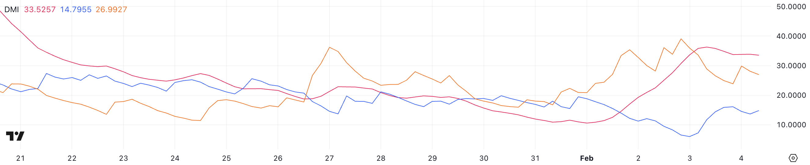 Графік DMI Solana показує, що її ADX становить 33,5, що є зростанням з 10,5 лише чотири дні тому. Хоча він досяг піку на рівні 36,2 день тому, його поточний рівень все ще вказує на зміцнення тренду.