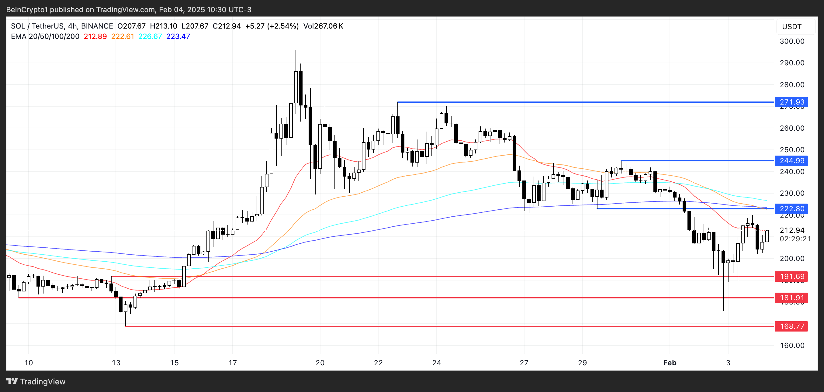 Ціна Solana наразі торгується між 222,8 доларів і 191 доларів, з її лініями EMA, що показують короткострокові змінні середні нижче довгострокових.