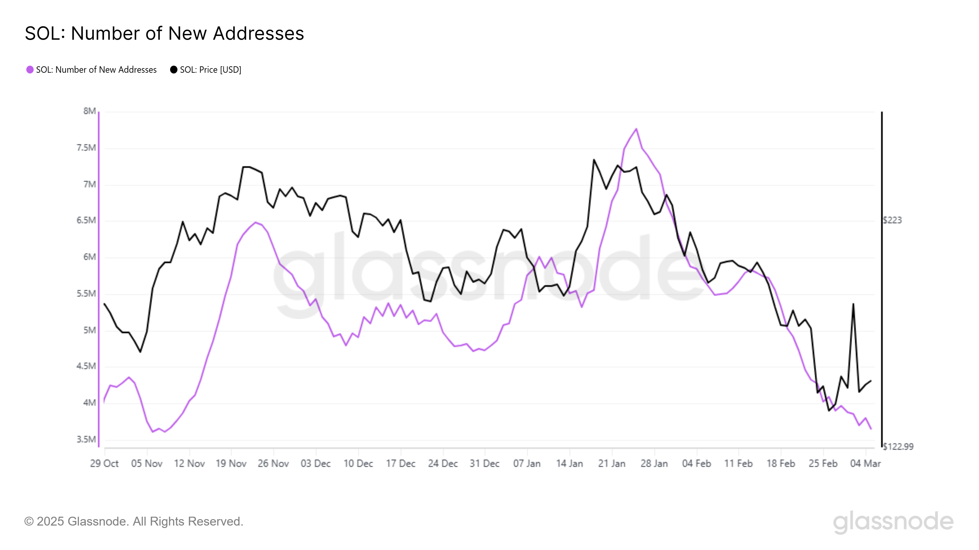 Загальний макроімпульс Solana також демонструє ознаки послаблення. Важливим показником цієї зміни є зменшення кількості нових адрес, які взаємодіють із мережею Solana. Число нових адрес упало до чотиримісячного мінімуму, що сигналізує про брак інтересу з боку нових інвесторів.