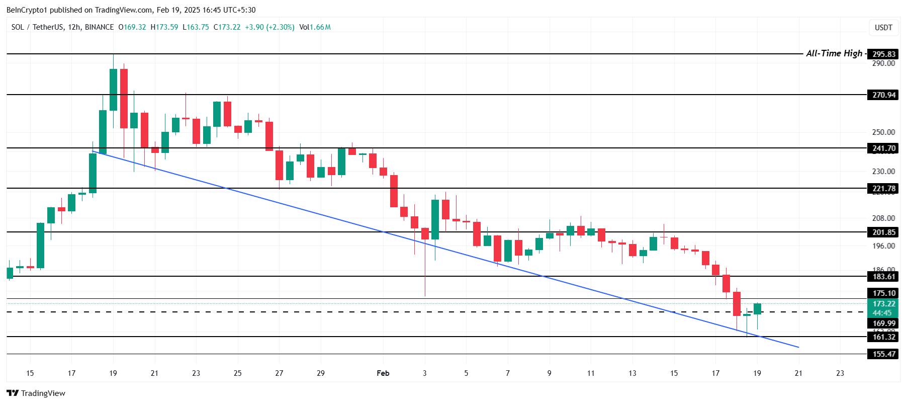 Ціна Solana зіткнулася з суттєвими викликами в останні місяці. Після досягнення свого історичного максимуму (ATH) у 295 доларів у середині січня, альткоїн демонструє стійкий спад, зараз торгуючись близько 173 доларів.