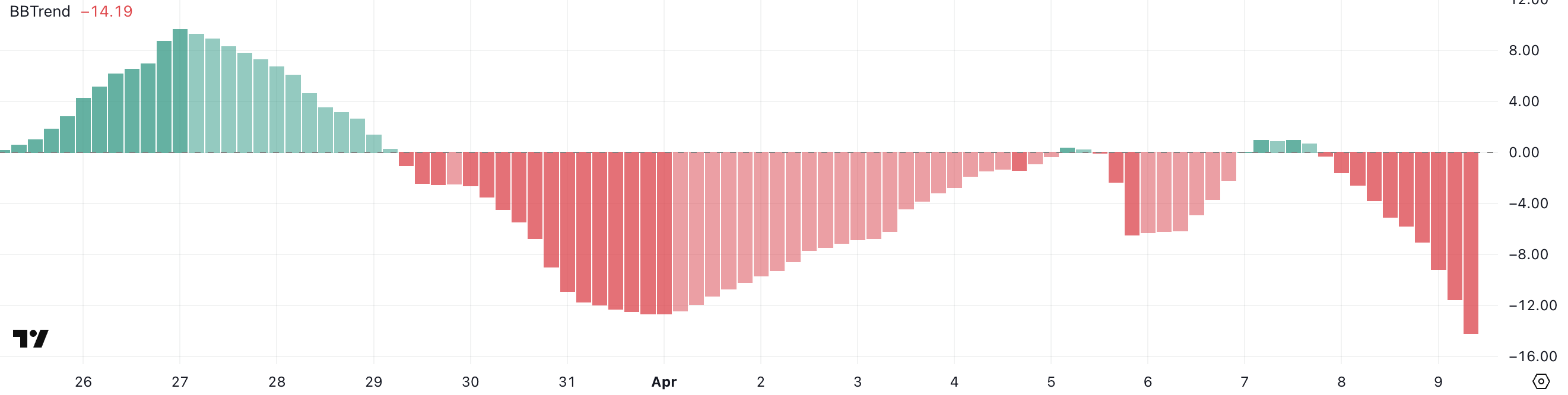 Позитивні значення BBTrend зазвичай відображають бичачий імпульс, тоді як негативні значення сигналізують про ведмежий імпульс. Чим глибше значення в негативній зоні, тим сильніший вважається тиск на зниження.