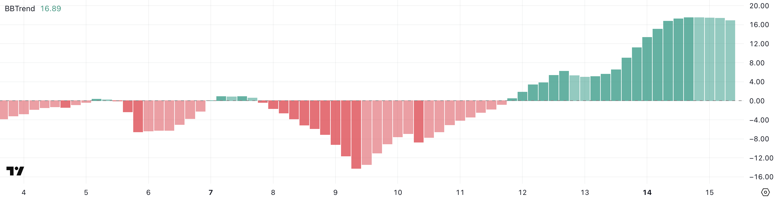 BBTrend, або індикатор тренду смуг Боллінджера, вимірює силу тренду на основі того, наскільки далеко ціна відходить від свого середнього діапазону. Показники вище 10 зазвичай сигналізують про сильний тренд у русі, тоді як нижчі значення відображають ринок у діапазоні або слабкий ринок.