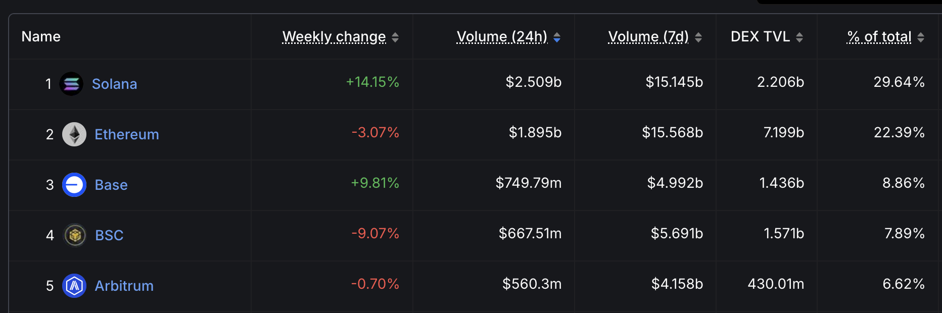 За останні 24 години Solana зафіксувала 2,5 млрд доларів у DEX-активності, що становить 14 % зростання за останні сім днів. Це зростання перевищує 10 % Base і різко контрастує зі зниженнями на Ethereum (-3 %) та BNB (-9 %).