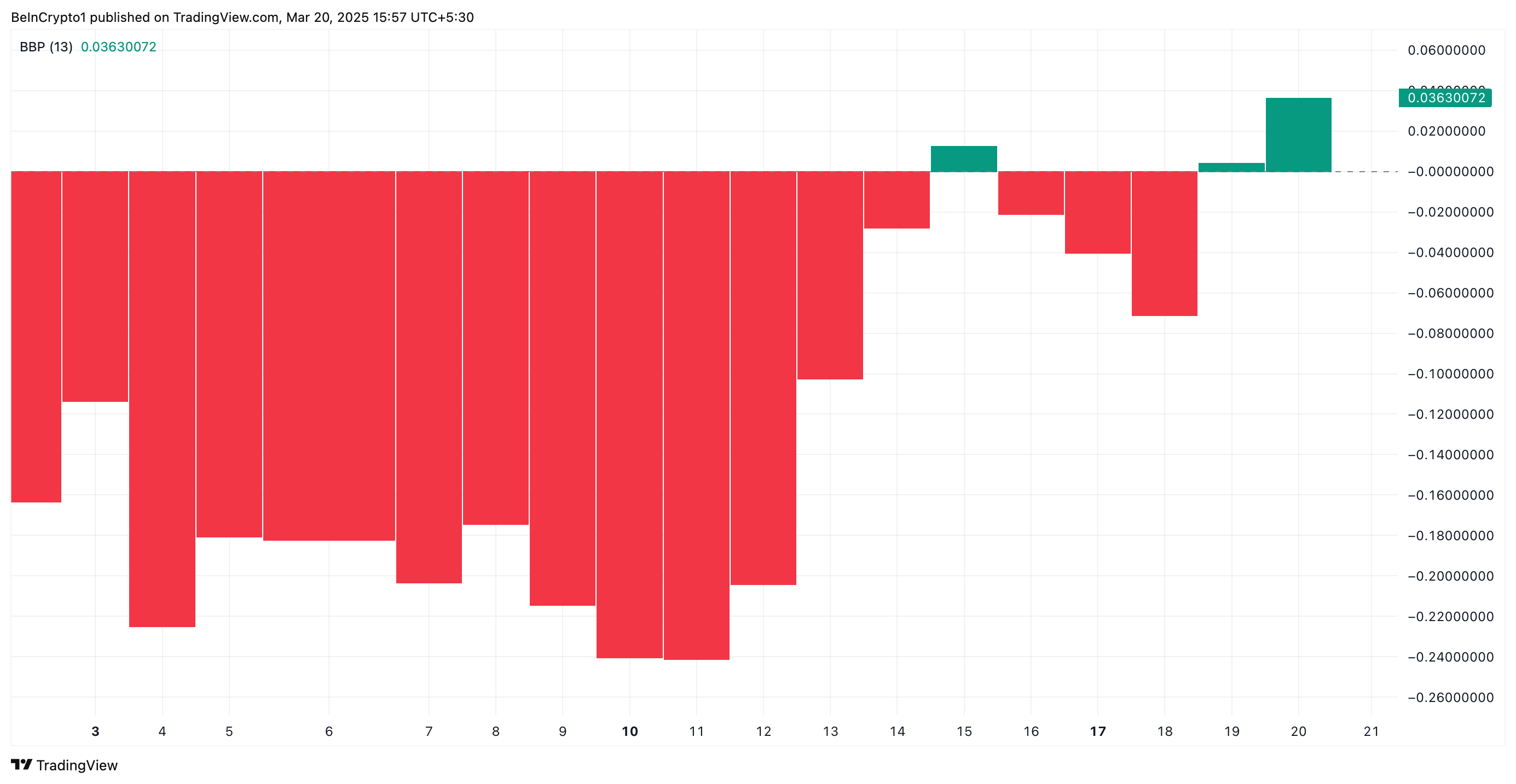 Цей індикатор вимірює баланс між бичачим і ведмежим тиском на ринку. Коли індекс позитивний, це означає, що покупці сильніші за продавців, що вказує на зростаючий попит і потенціал для подальшого зростання ціни.