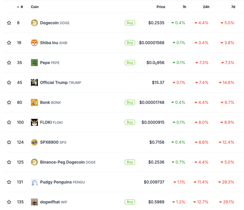 Усі топ-10 мемкоінів зазнали втрат, з Pudgy Penguins (PENGU) та Dogwifhat (WIF), які очолили спад.
