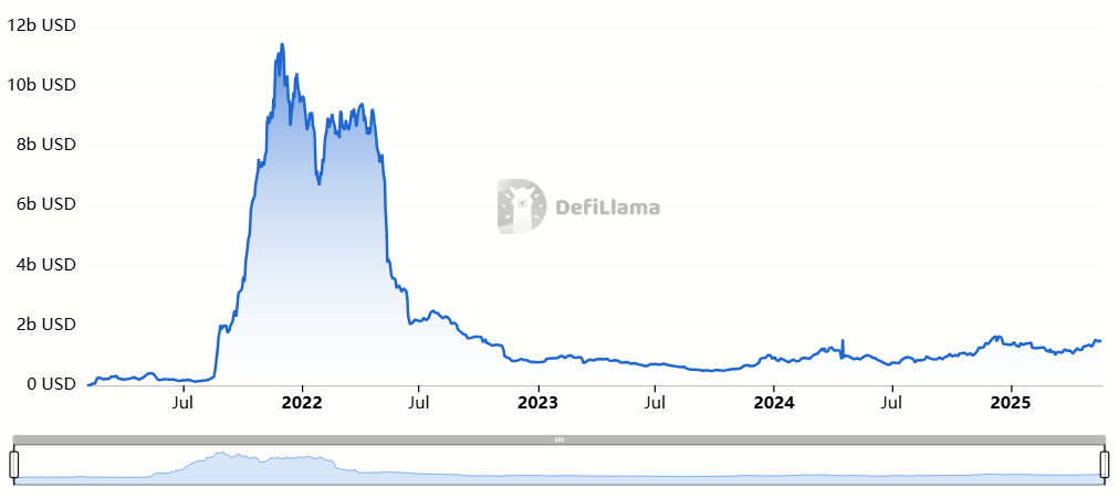 Однак не все ідеально для Avalanche. Дані від DefiLlama показують, що загальна заблокована вартість (TVL) AVAX становить лише 1,56 млрд доларів, що на 86% менше від його історичного максимуму.