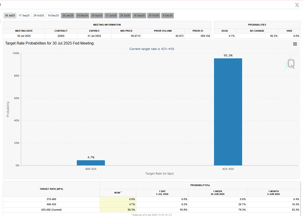 Згідно з інструментом CME FedWatch, трейдери ставок оцінюють 95,3% ймовірність того, що ФРС залишить процентні ставки без змін на наступному засіданні 30 липня.