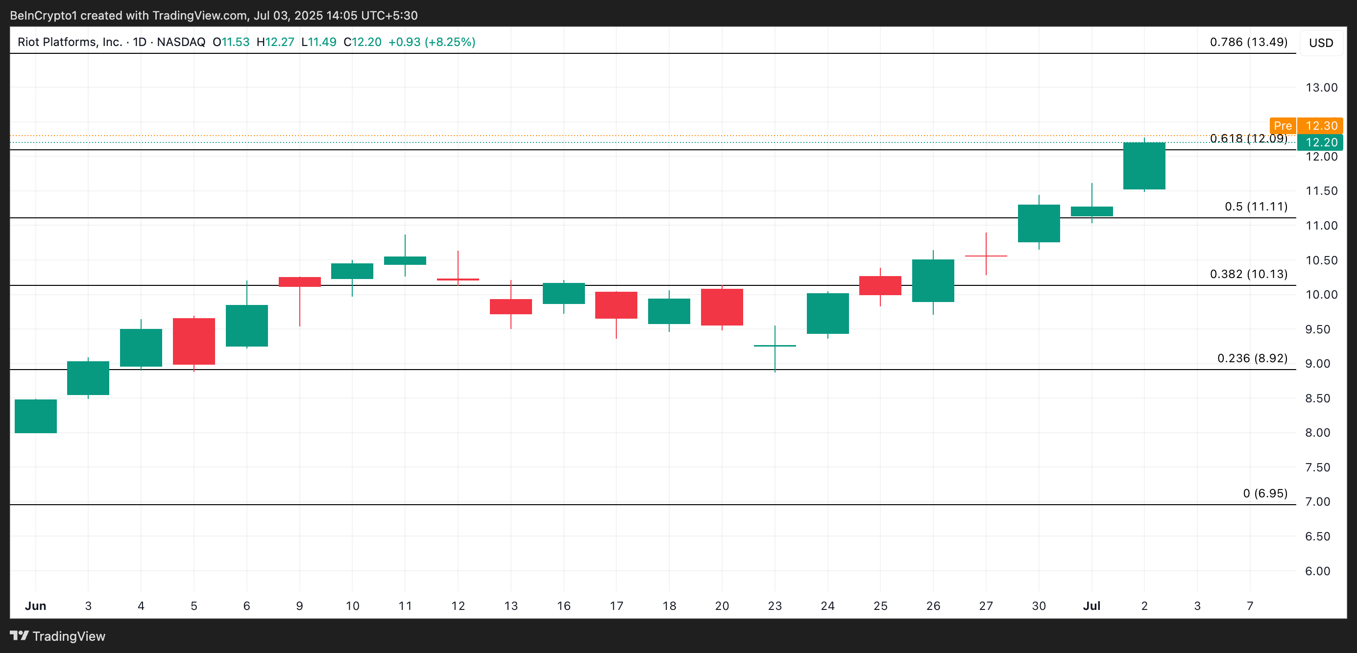 На момент публікації акції RIOT торгуються на рівні 12,30 доларів, що вище від попереднього закриття на рівні 12,20 доларів. Якщо тиск покупців зросте при початку торгів, акції можуть піднятися до 13,49 доларів.