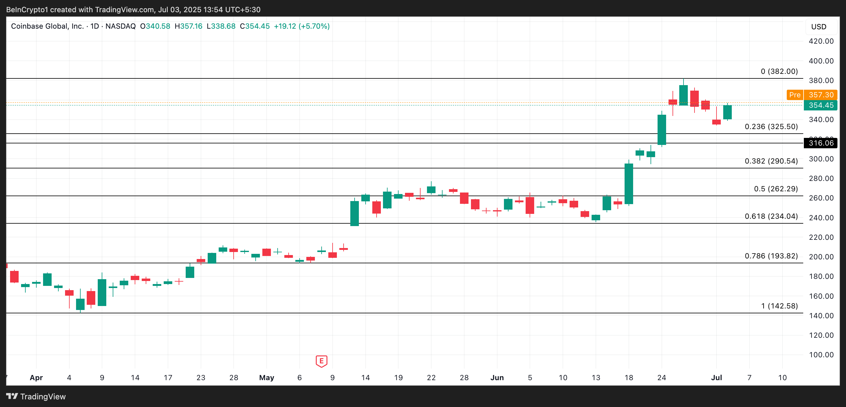 COIN торгувався на рівні 357,24 доларів під час передринкової сесії сьогодні. Якщо попит інвесторів зросте при відкритті ринку, акції можуть піднятися до 382 доларів.