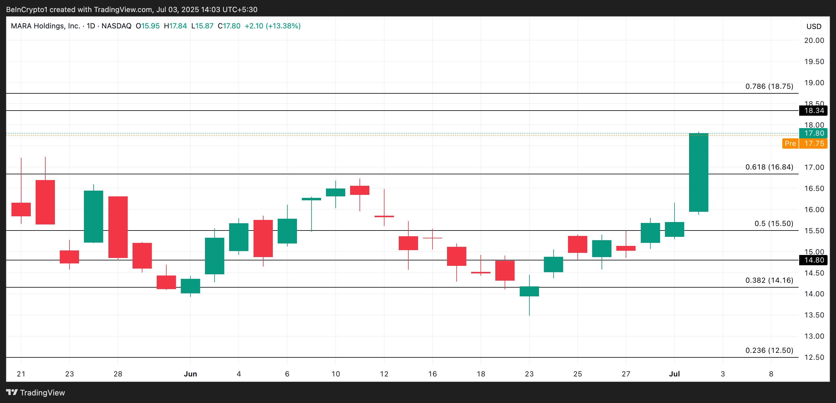 Sponsored SponsoredНа передринковій сесії сьогодні MARA торгується на рівні 17,75 доларів. Якщо попит зросте при відкритті ринку, акції можуть піднятися до 18,34 доларів.