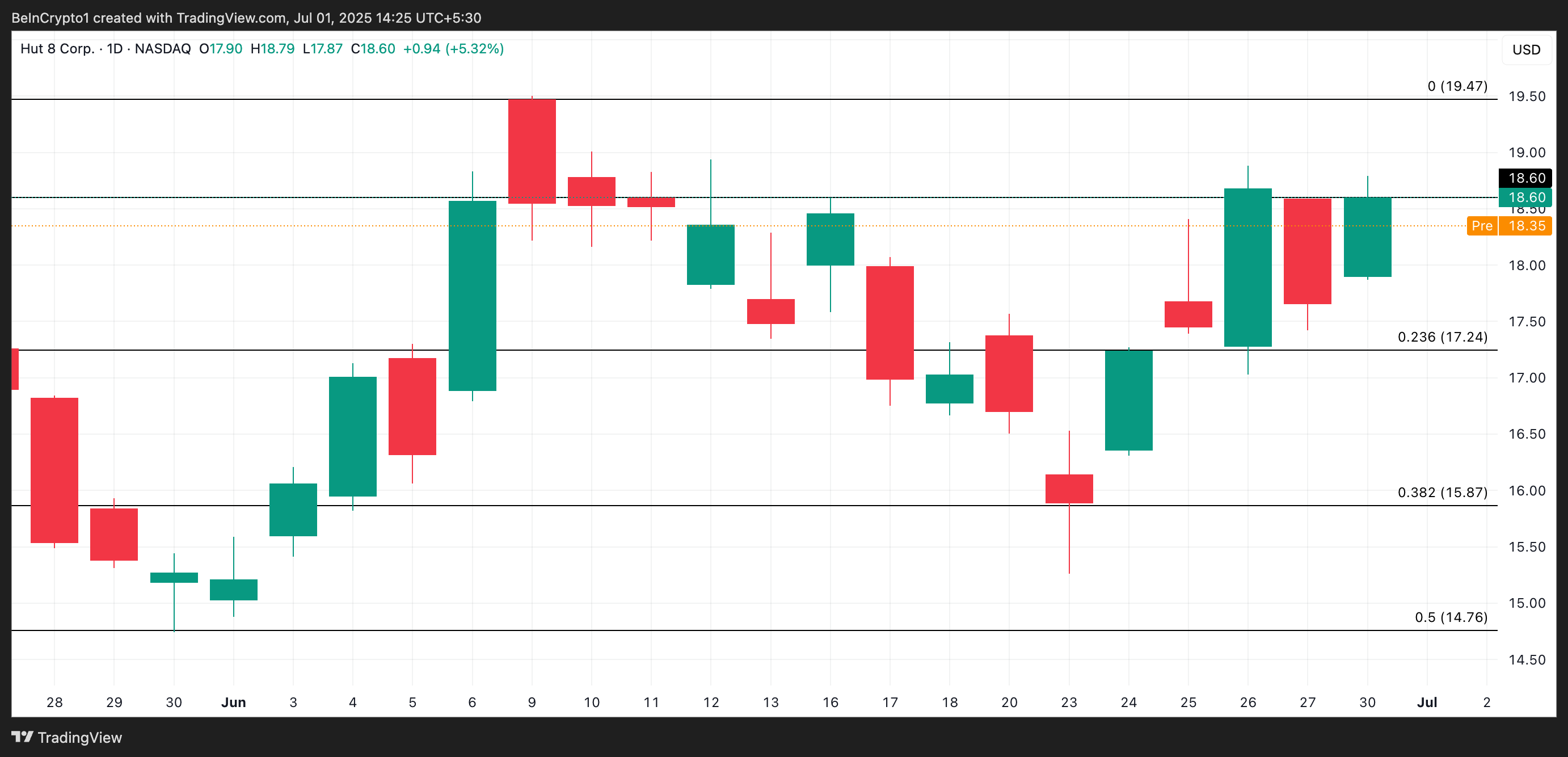 Бичачий настрій навколо цього оголошення підштовхнув акції Hut 8 до 18,60 доларів, що на 5,32 % більше в понеділок. Акція торгується на рівні 18,35 доларів під час передринкової торгової сесії сьогодні.