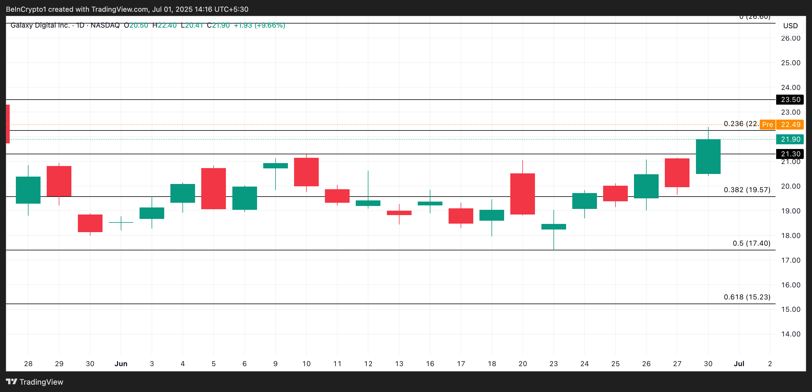 На закритті торгової сесії в понеділок GLXY зріс на 2 % до 21,90 доларів, відображаючи відновлення бичачого імпульсу. Під час передринкової торгової сесії сьогодні GLXY оцінюється в 22,49 доларів.