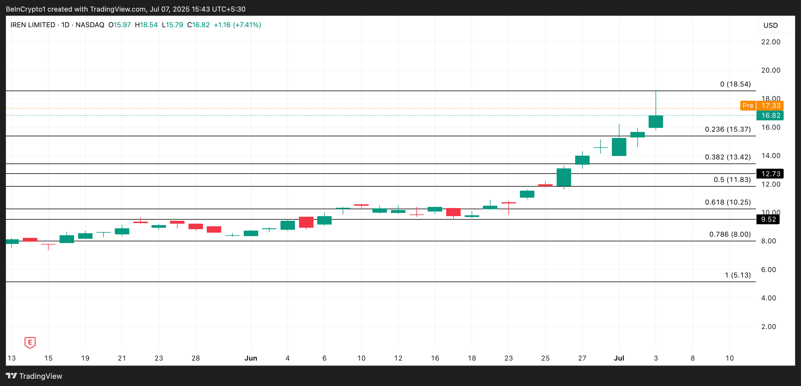 IREN торгується за 17,33 доларів у передринковій сесії, що на 3% вище від попереднього закриття в 16,82 доларів. Якщо попит зросте, коли ринок відкриється, вартість акцій може зрости до 18,54 доларів.
