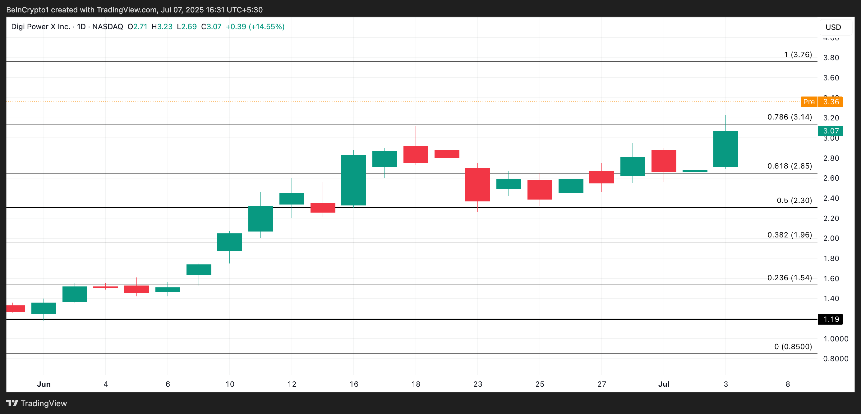 Під час передринкової торгівлі сьогодні DGXX піднявся ще вище до 3,36 доларів. Якщо бичачий імпульс продовжиться після офіційного початку торгів, акції можуть піднятися до 3,76 доларів.
