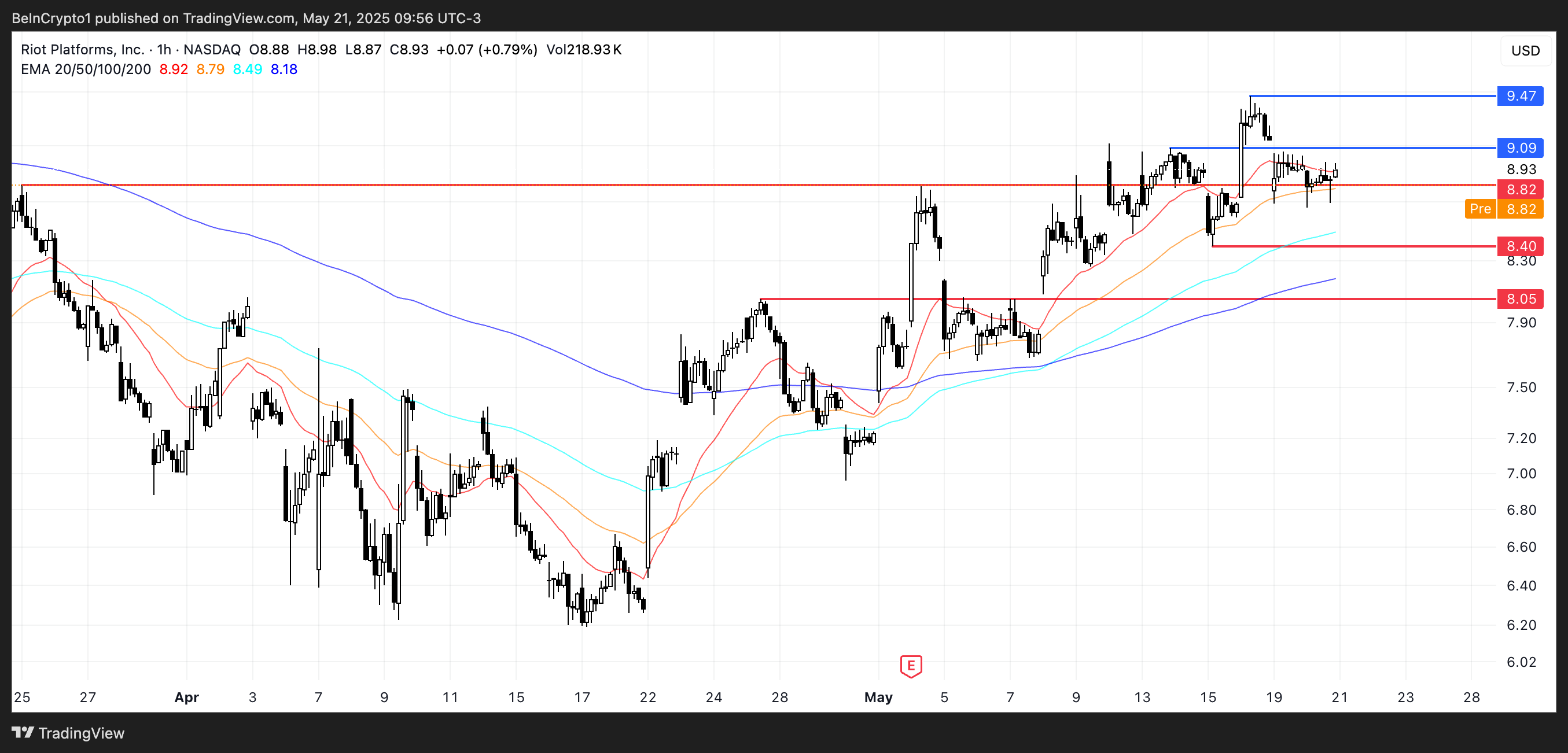 З технічної точки зору, RIOT стикається з опором на рівні $9,09; прорив вище цього рівня може призвести до зростання до $9,47.