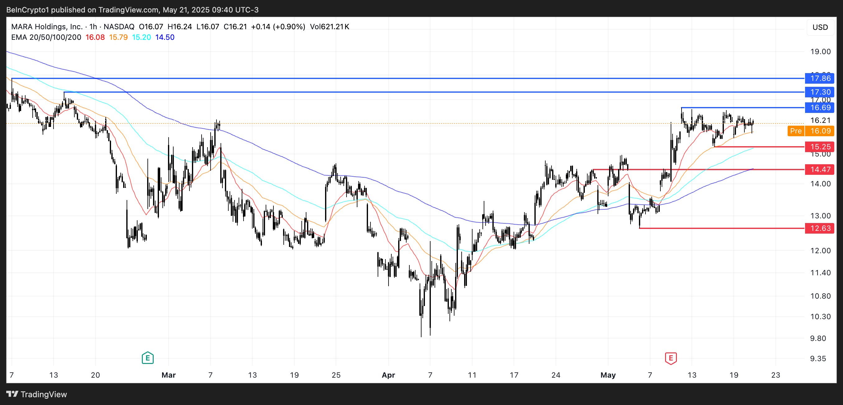 Незважаючи на це, MARA розширила свої володіння біткоїнами до 47 531, що становить зростання на 174 % у річному обчисленні. Технічно, MARA підтримує бичачу структуру експоненційної змінної середньої (EMA), але звуження розриву вказує на обережність. Якщо імпульс зникне, акція може протестувати підтримку на рівні 15,25 доларів, з подальшим ризиком зниження до 14,47 доларів або навіть 12,63 доларів.