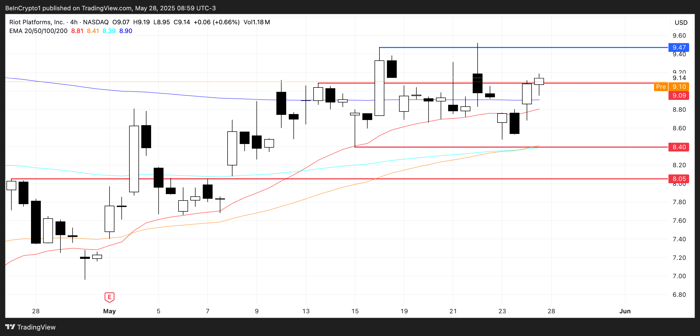 Наразі перебуваючи поблизу 9,09 доларів, RIOT може отримати подальший імпульс, якщо прорветься вище 9,47 доларів — особливо якщо незабаром може сформуватися золотий перетин на її лініях EMA.