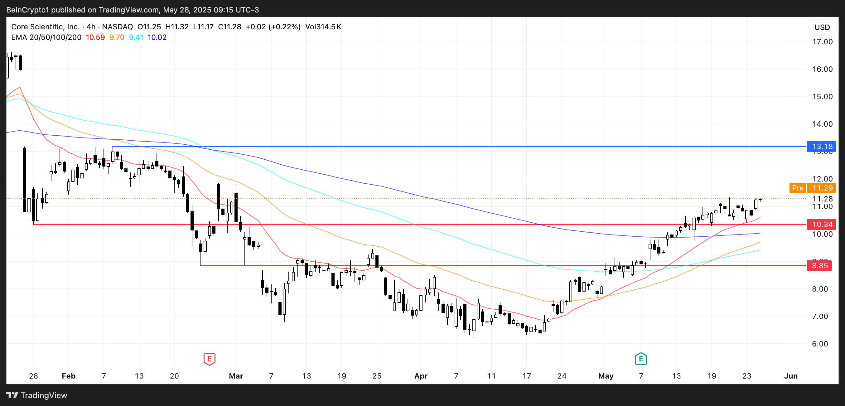 З технічної точки зору, лінії експоненційної змінної середньої (EMA) CORZ звужуються, що сигналізує про можливість появи золотого перетину — часто бичачого патерну, пов’язаного з підвищенням ціни.