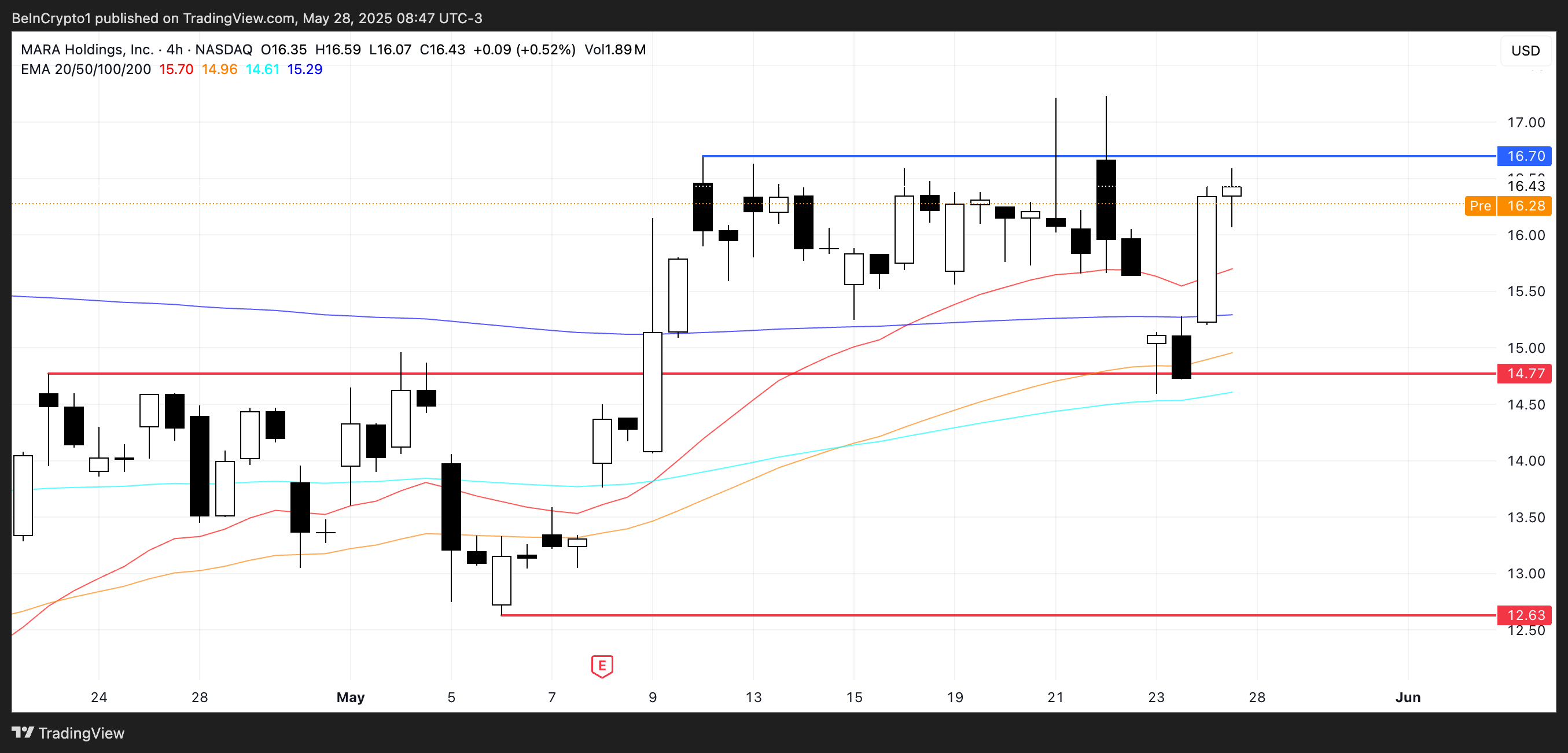 Наступний опір знаходиться поблизу 16,70 доларів; прорив там може підняти MARA вище 17 доларів вперше з середини лютого, сигналізуючи про продовження бичачого тренду. Навпаки, якщо продавці знову візьмуть контроль і знизять ціну нижче рівня підтримки 14,77 доларів, MARA може знизитися далі до 12,63 доларів.