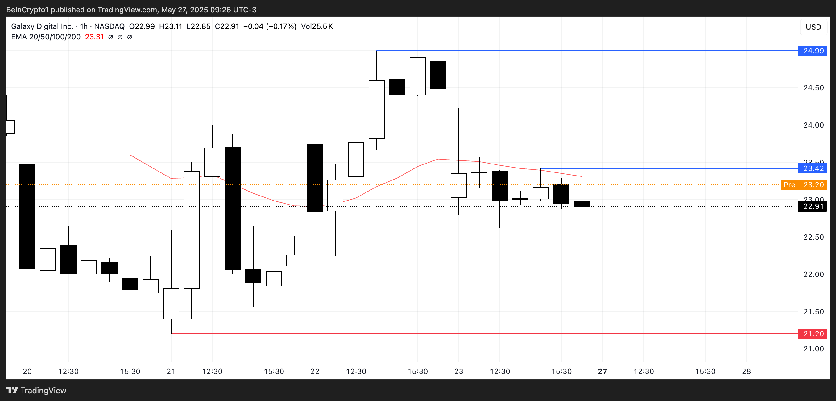 З технічної точки зору, GLXY наближається до важливого моменту. Якщо нещодавня корекція поглибиться, акція може впасти, щоб протестувати рівень підтримки в 21,20 доларів. Навпаки, якщо покупці втрутяться і висхідний тренд відновиться, GLXY може спочатку протестувати опір на рівні 23,42 доларів.