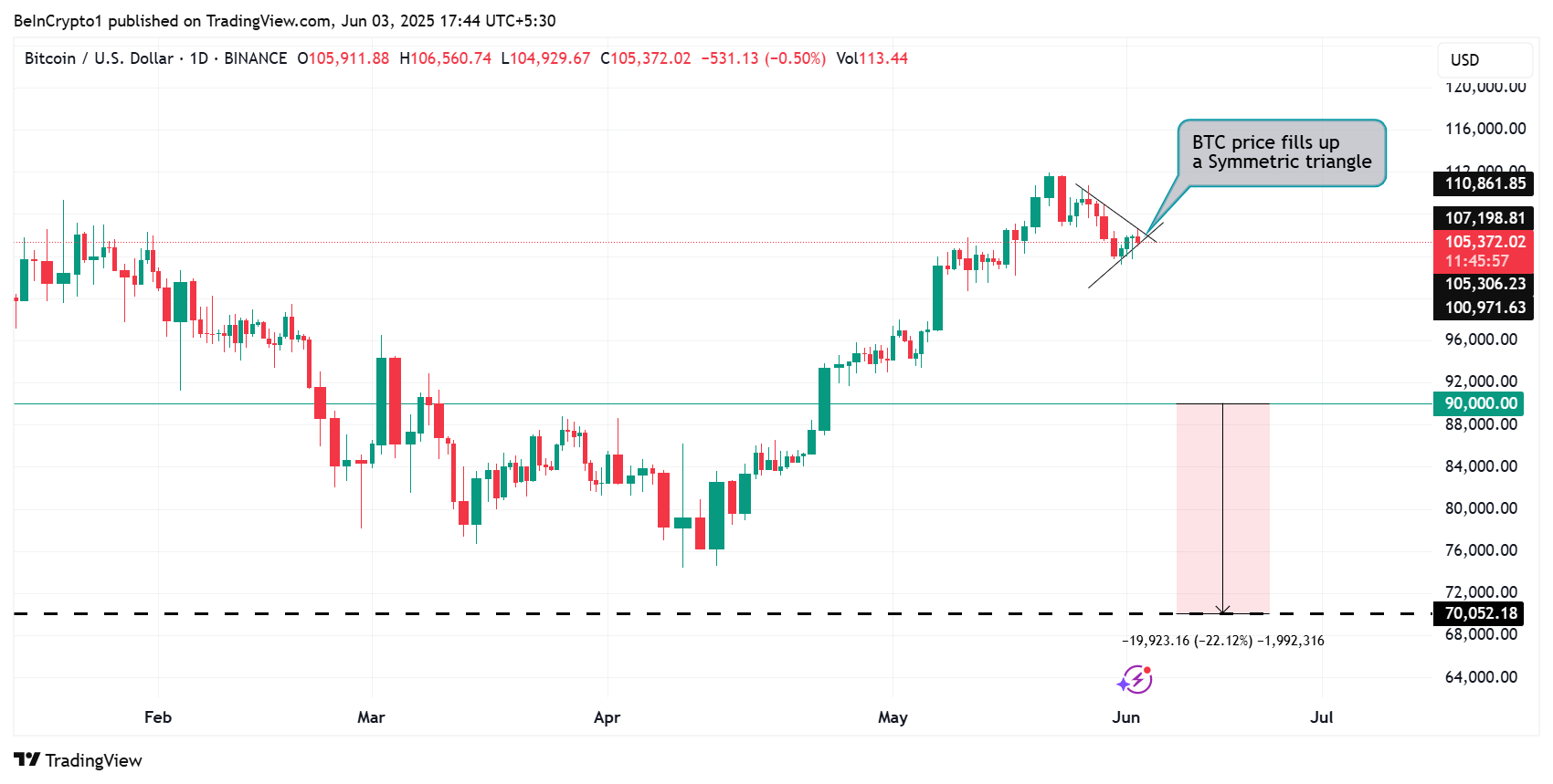 Рішуче закриття свічки нижче нижньої трендової лінії або верхньої межі симетричного трикутника може визначити наступний напрямок руху біткоїна.