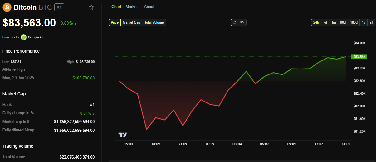 Дані BeInCrypto показують, що біткоїн торгувався за 83 563 долари на момент публікації. Це становить скромне зростання на 0,89% за останні 24 години.