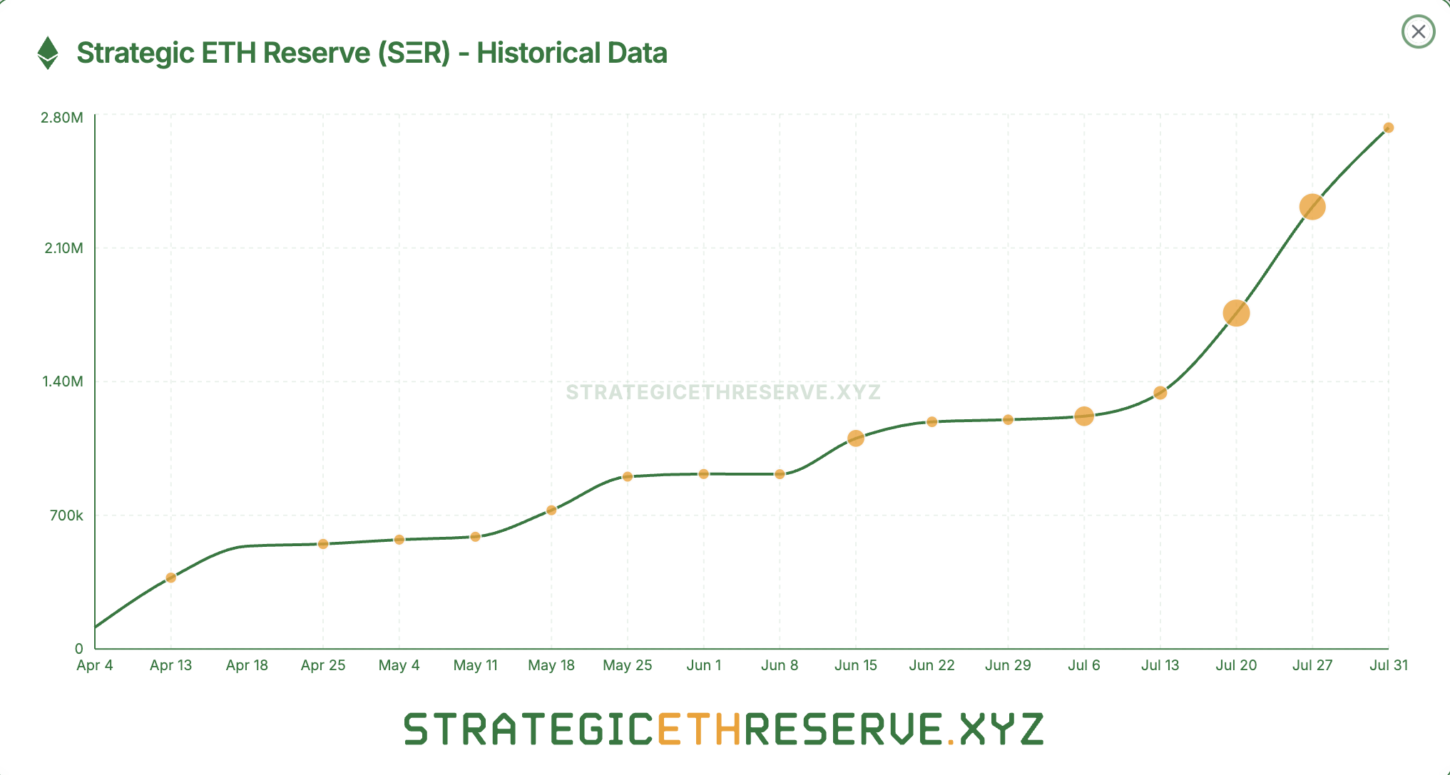 Відповідно до останніх даних з вебсайту Стратегічного резерву ETH, на початку квітня резерв утримував лише 200 мільйонів доларів, і ці активи постійно зростали. Проте, тренд прискорився, коли все більше публічних компаній почали впроваджувати Ethereum як основний резервний актив.