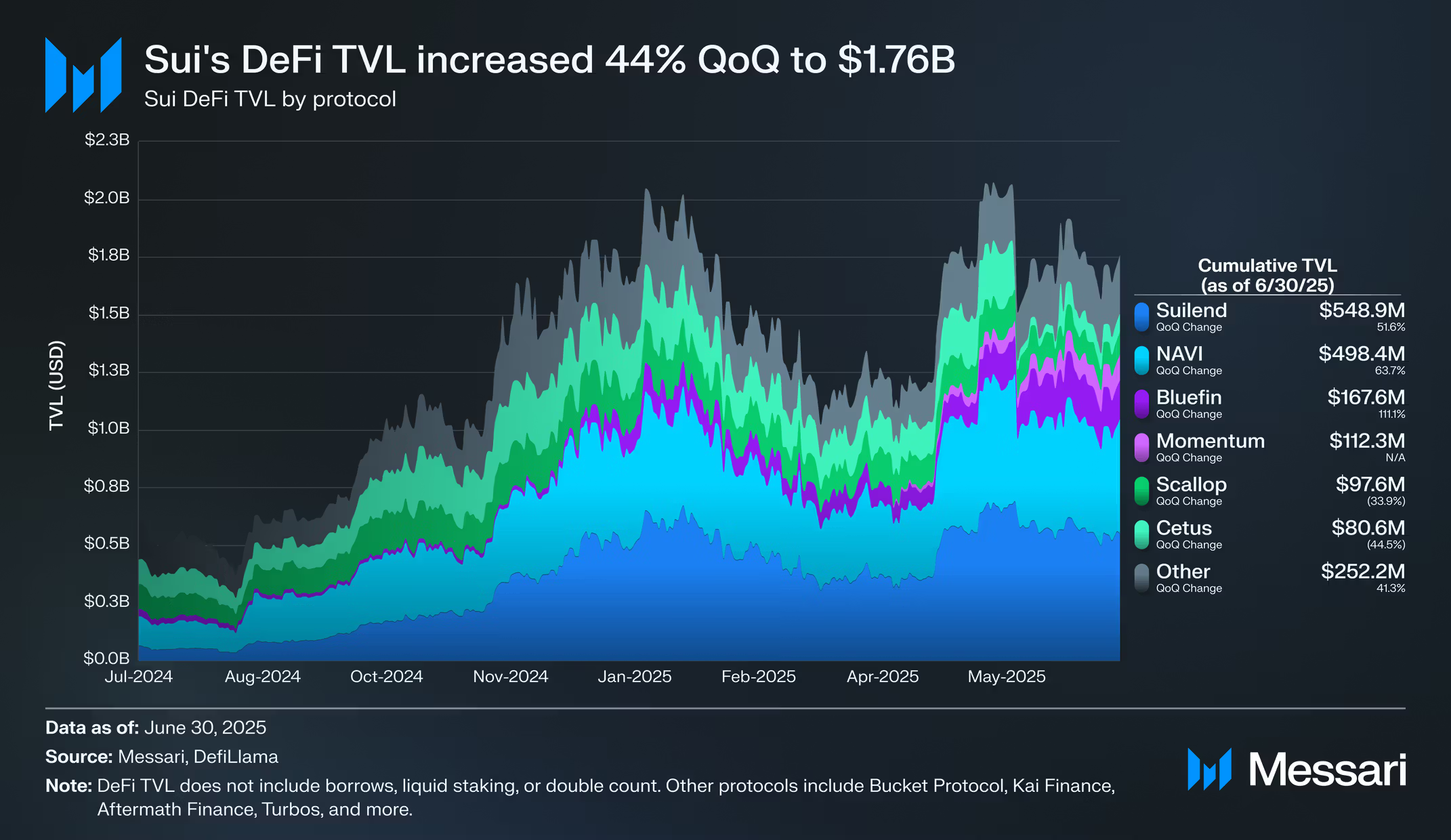 Ще одним важливим моментом стали капітальні надходження у DeFi. Загальна заблокована вартість (TVL) Sui зросла на 44,3 % у порівнянні з попереднім кварталом, досягнувши 1,76 млрд доларів.