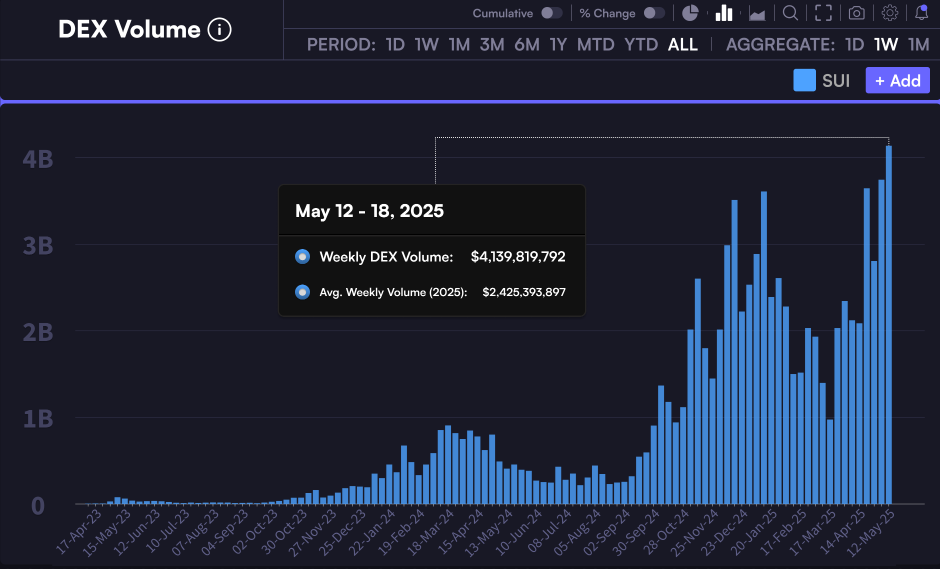 Sponsored SponsoredТим часом обсяг щотижневих децентралізованих бірж (DEX) також досяг нових висот. Це свідчить про різке зростання активності користувачів і ліквідності в екосистемі Sui.
