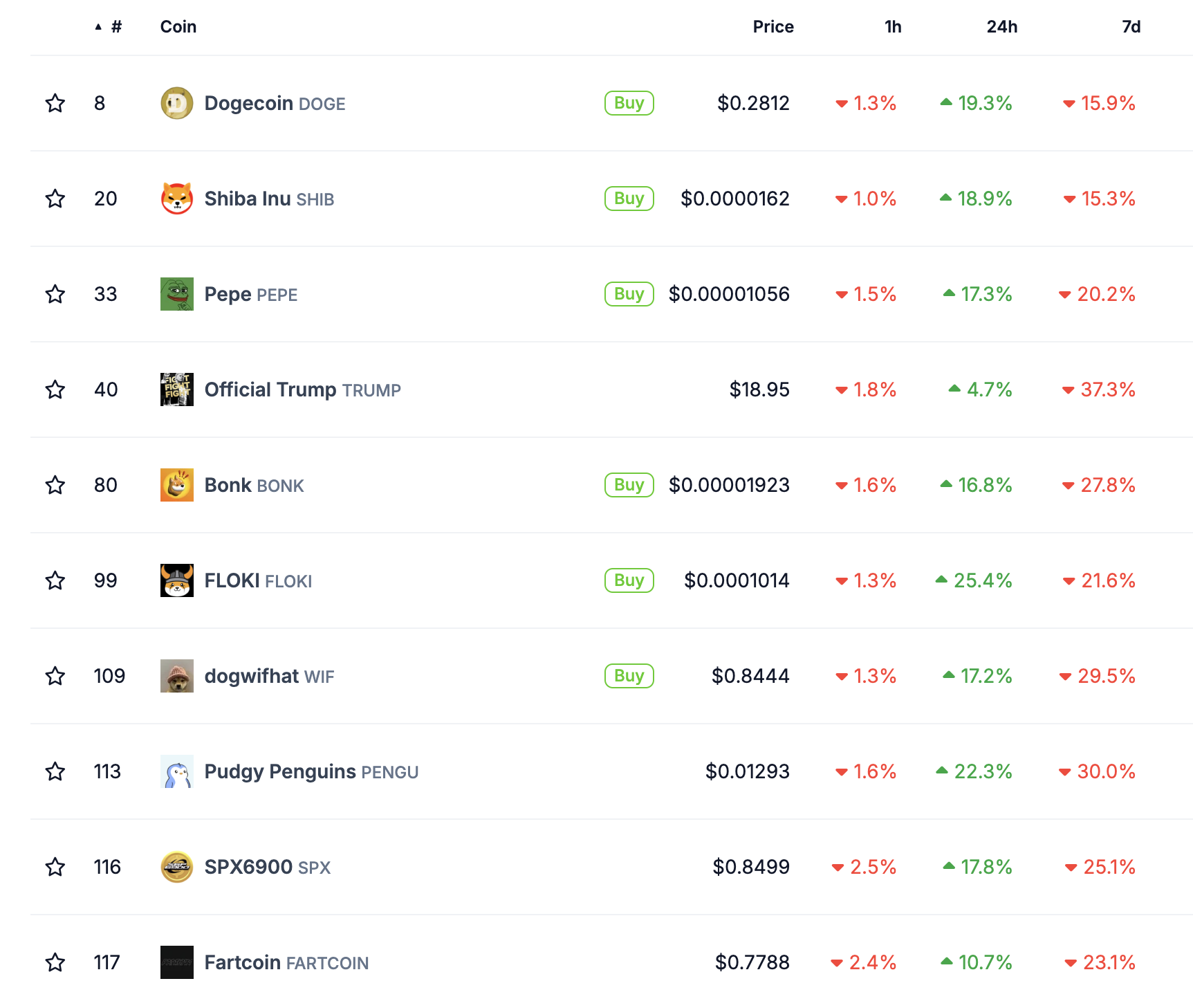 За даними CoinGecko, їх загальна капіталізація зросла трохи більше ніж на 4%. Топ-10 мемкоїнів зросли на двозначні відсотки, за винятком TRUMP. Floki (FLOKI), Pengu та Dogecoin (DOGE) стали найбільшими переможцями за останні 24 години.