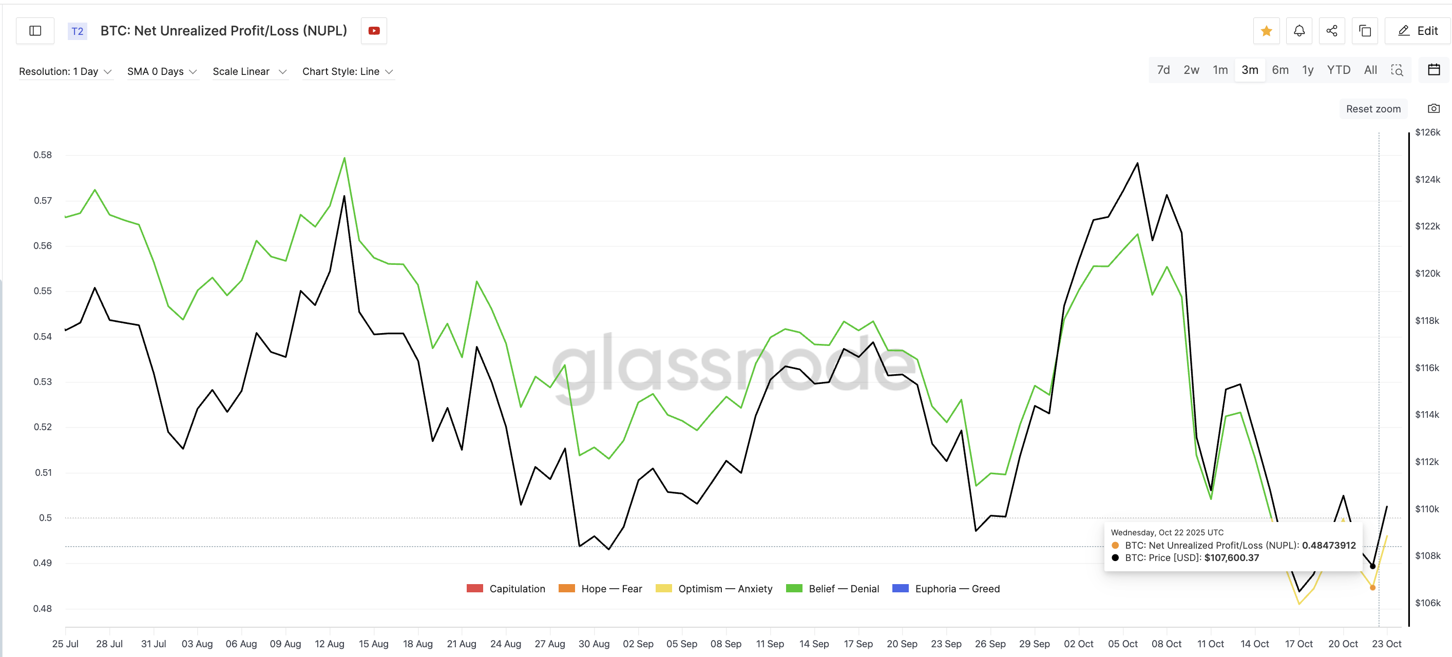 Станом на 23 жовтня NUPL знаходиться близько до свого тримісячного мінімуму в 0,48. Востаннє, коли вона торкалася цього рівня, ціна біткоїна зросла на 3,8% за кілька днів.
