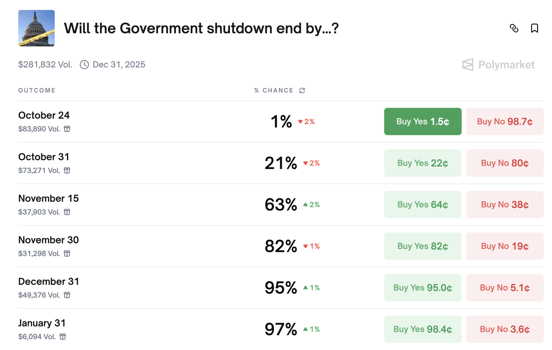 Однак схвалення криптовалютних ETF призупинено через триваюче припинення роботи уряду США . Трейдери на платформі прогнозів Polymarket тепер призначають 63% ймовірності того, що Конгрес вийде з глухого кута до 15 листопада. При цьому шанси на більш пізні дати набагато вище.