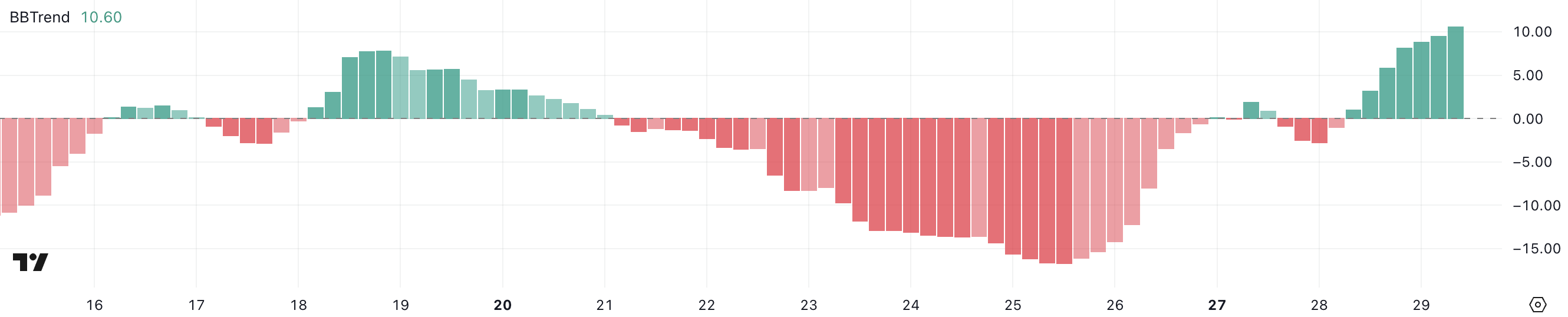 BBTrend (Bollinger Band Trend) вимірює моментум, аналізуючи позиціонування ціни в межах смуг Боллінджера. Позитивні значення вказують на оптимізм (ринковий), тоді як негативні значення свідчать про ведмежий тиск.