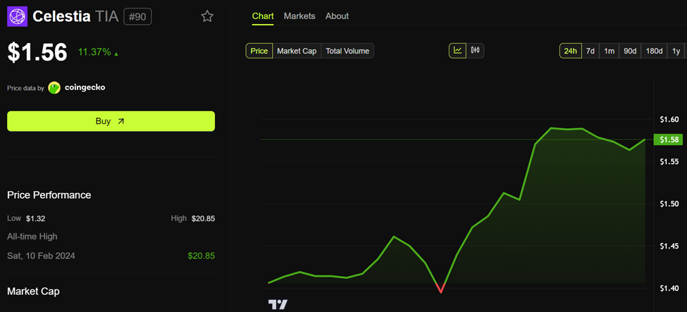 Дані BeInCrypto показують, що TIA зріс більш ніж на 11 % на цій новині і торгувався за 1,56 доларів на момент написання.