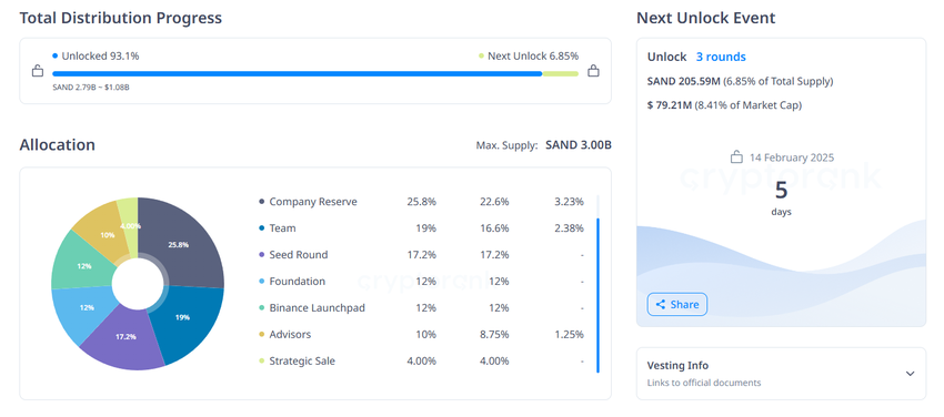 SAND має загальну пропозицію у 3 мільярди токенів, з яких 93% вже розблоковано та знаходяться в обігу. 14 лютого буде розблоковано ще 205,59 мільйона токенів SAND вартістю майже 79,2 мільйона доларів.