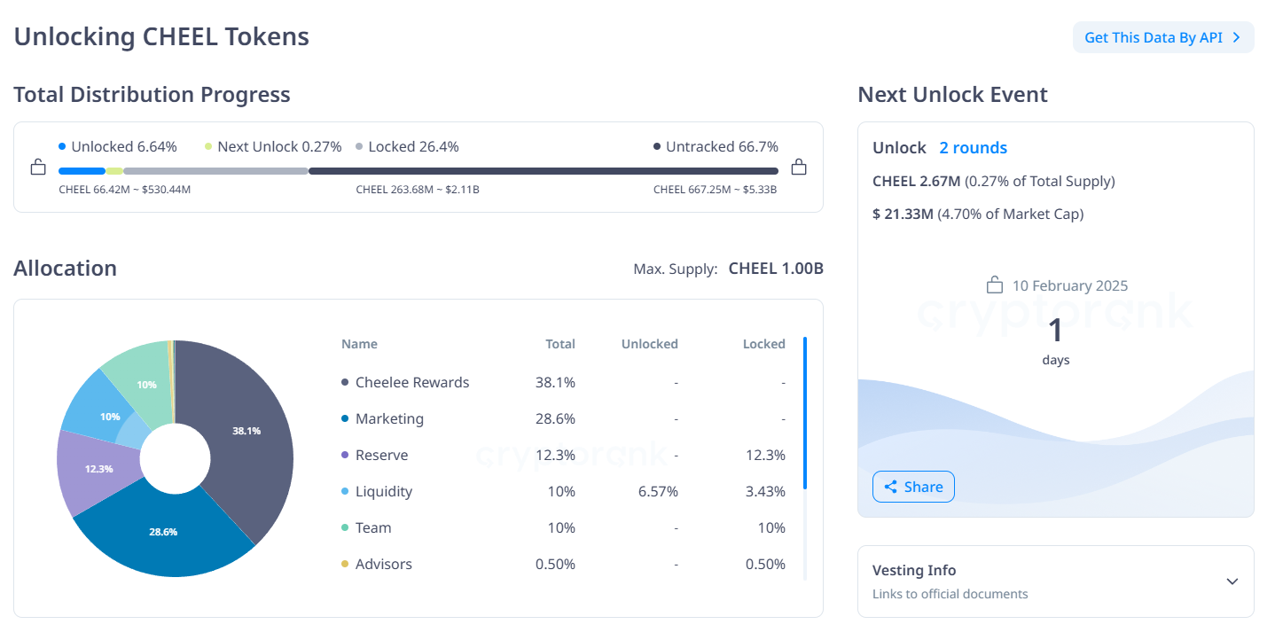 Загальна пропозиція CHEEL становить 1 мільярд токенів, з яких лише 6,64% розблоковано на даний момент. 10 лютого буде розблоковано ще 2,67 мільйона токенів вартістю близько 21,34 мільйонів доларів.
