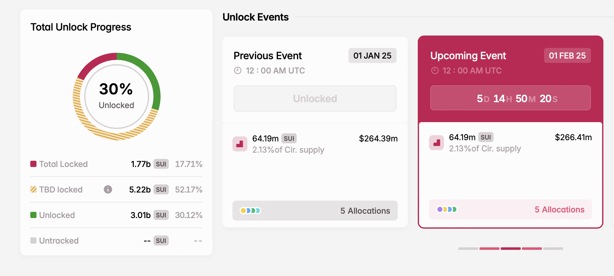 Токен SUI дозволяє управління, дозволяючи власникам голосувати за пропозиції та формувати майбутнє платформи. 1 лютого відбудеться велике розблокування токенів, виділених учасникам серій A і B, резерву спільноти та казначейства Mysten Labs.